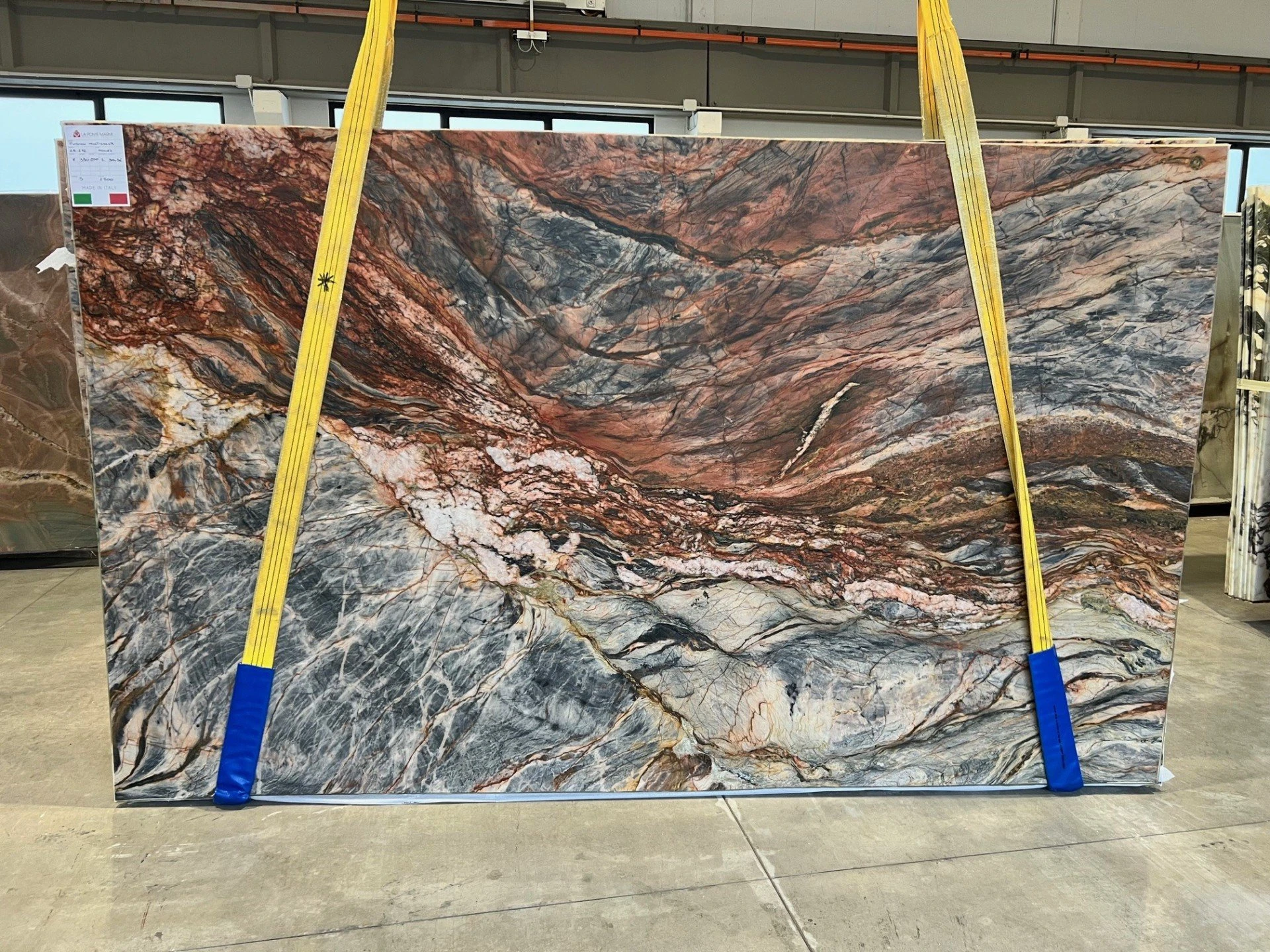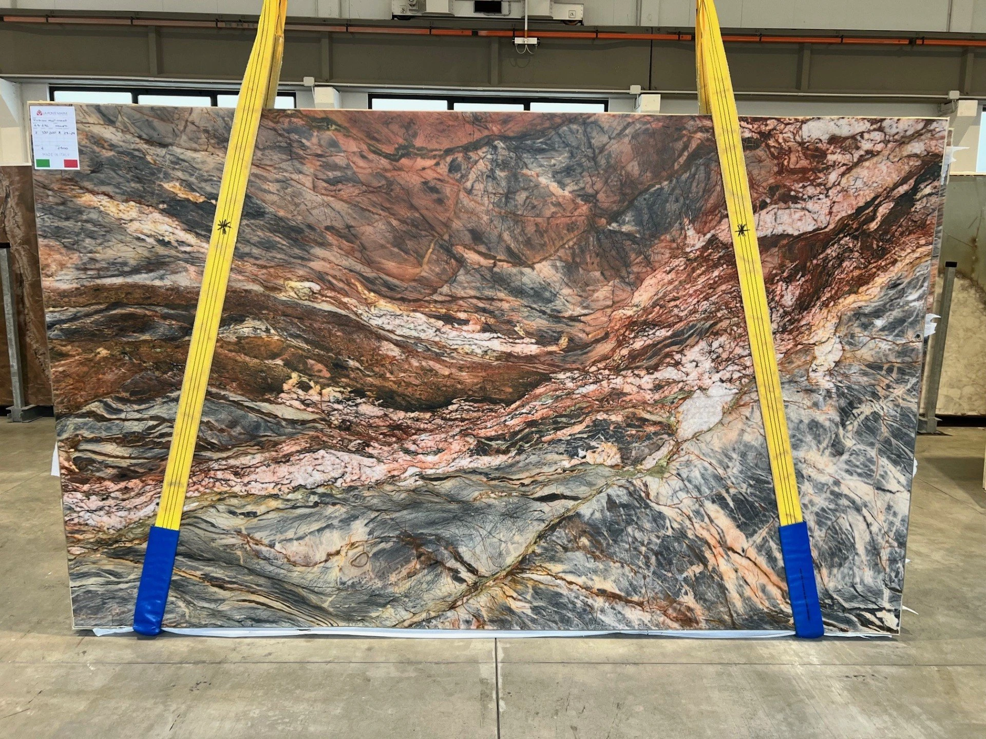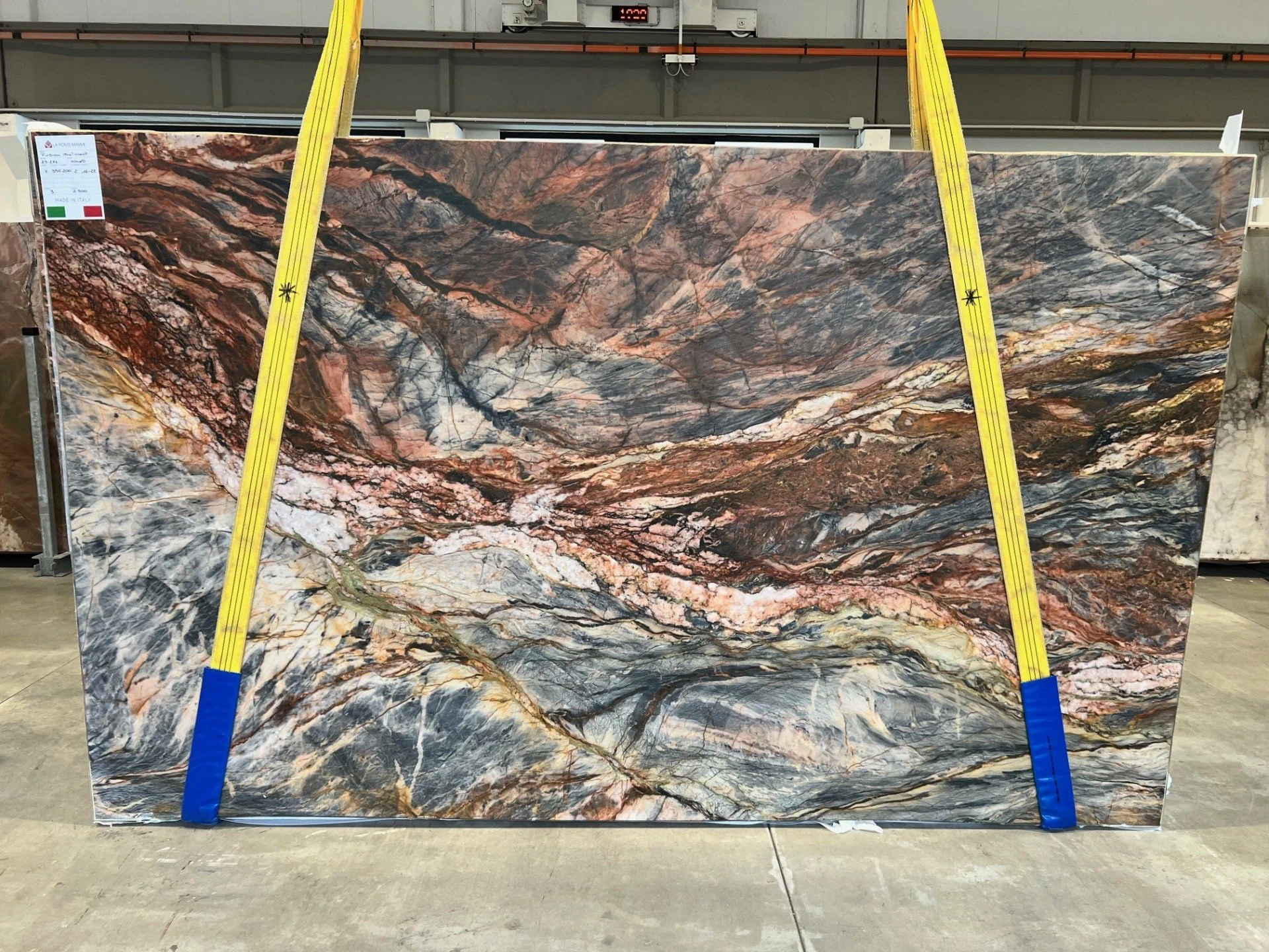 < Torna indietro FUSION Tipologia: GRANITO Codice blocco: 25B272 N. Lastre: 55 Lunghezza: 320 cm Altezza: 190 cm Spessori disponibili: 2 CM. Finiture disponibili: LEVIGATO