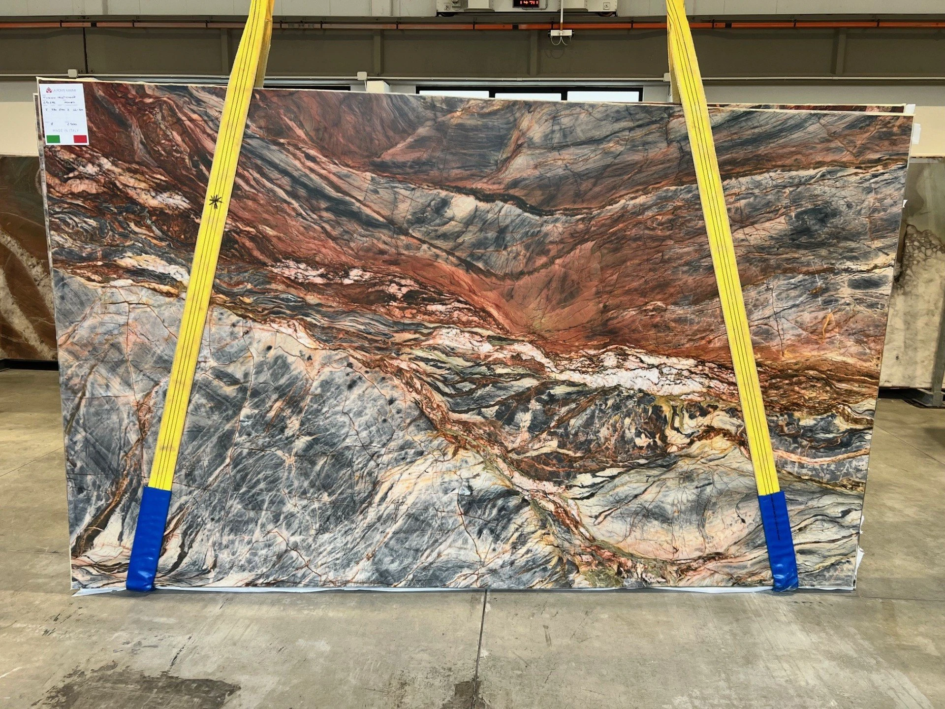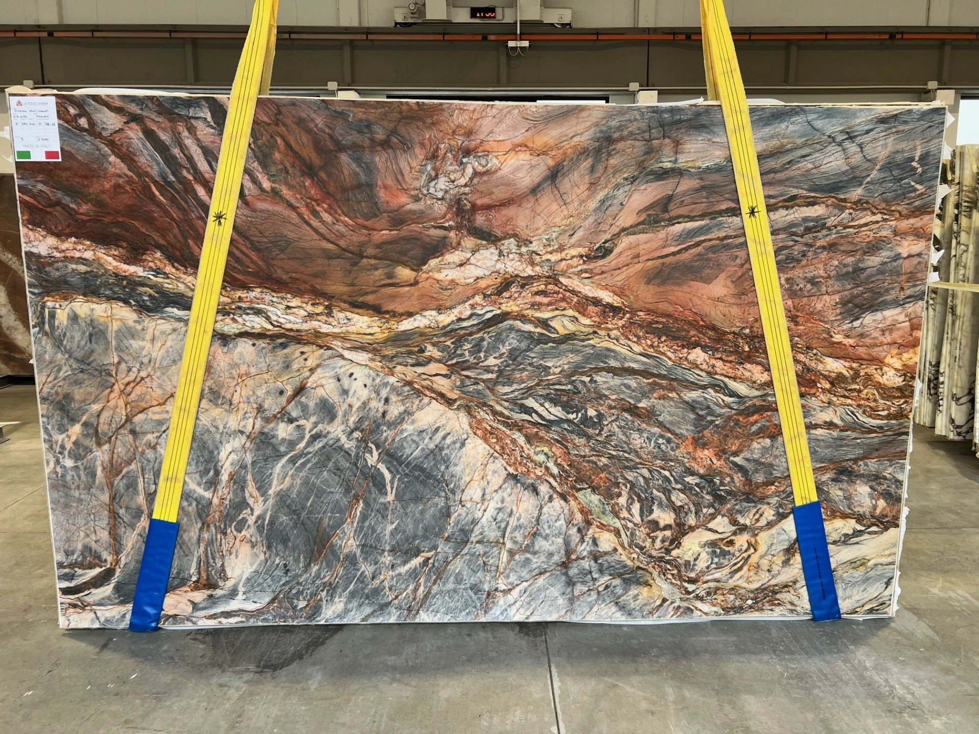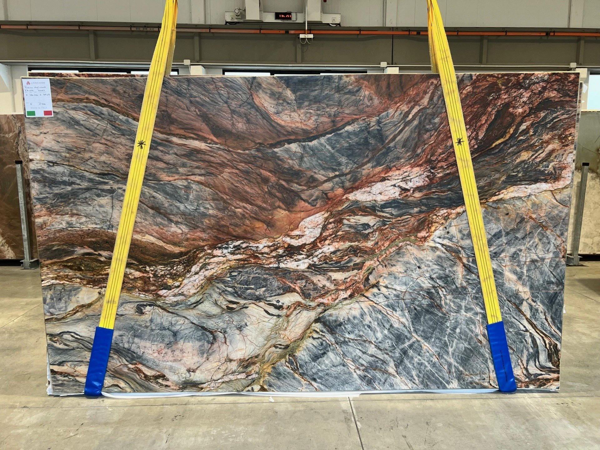 < Torna indietro FUSION Tipologia: GRANITO Codice blocco: 25B272 N. Lastre: 55 Lunghezza: 320 cm Altezza: 190 cm Spessori disponibili: 2 CM. Finiture disponibili: LEVIGATO