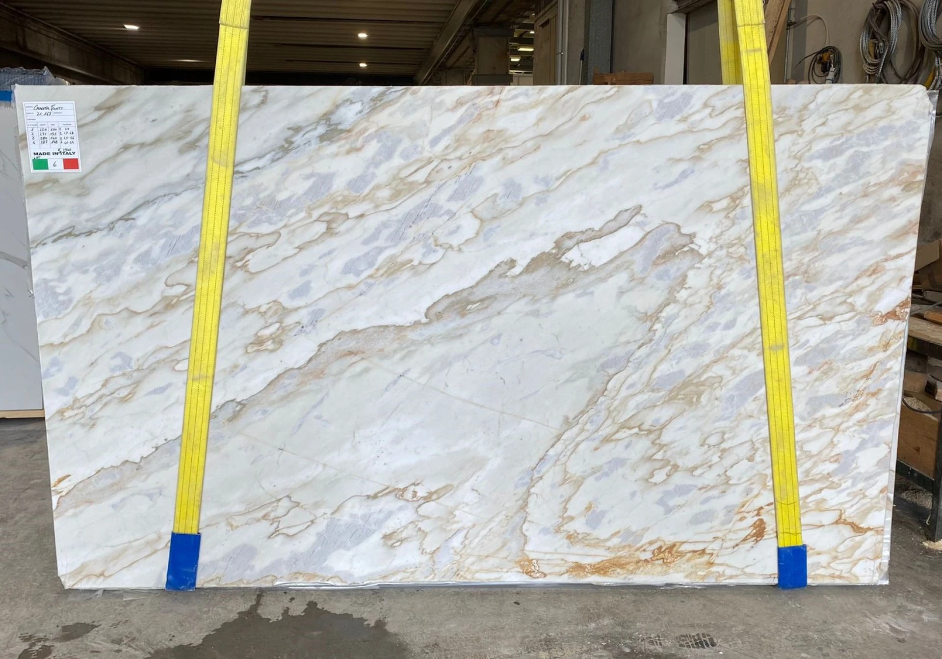 < Torna indietro CALACATTA FORTE Tipologia: MARMO Codice blocco: 21B167 N. Lastre: 7 Lunghezza: 280 cm Altezza: 165 cm Spessori disponibili: 2 CM. Finiture disponibili: LEVIGATO