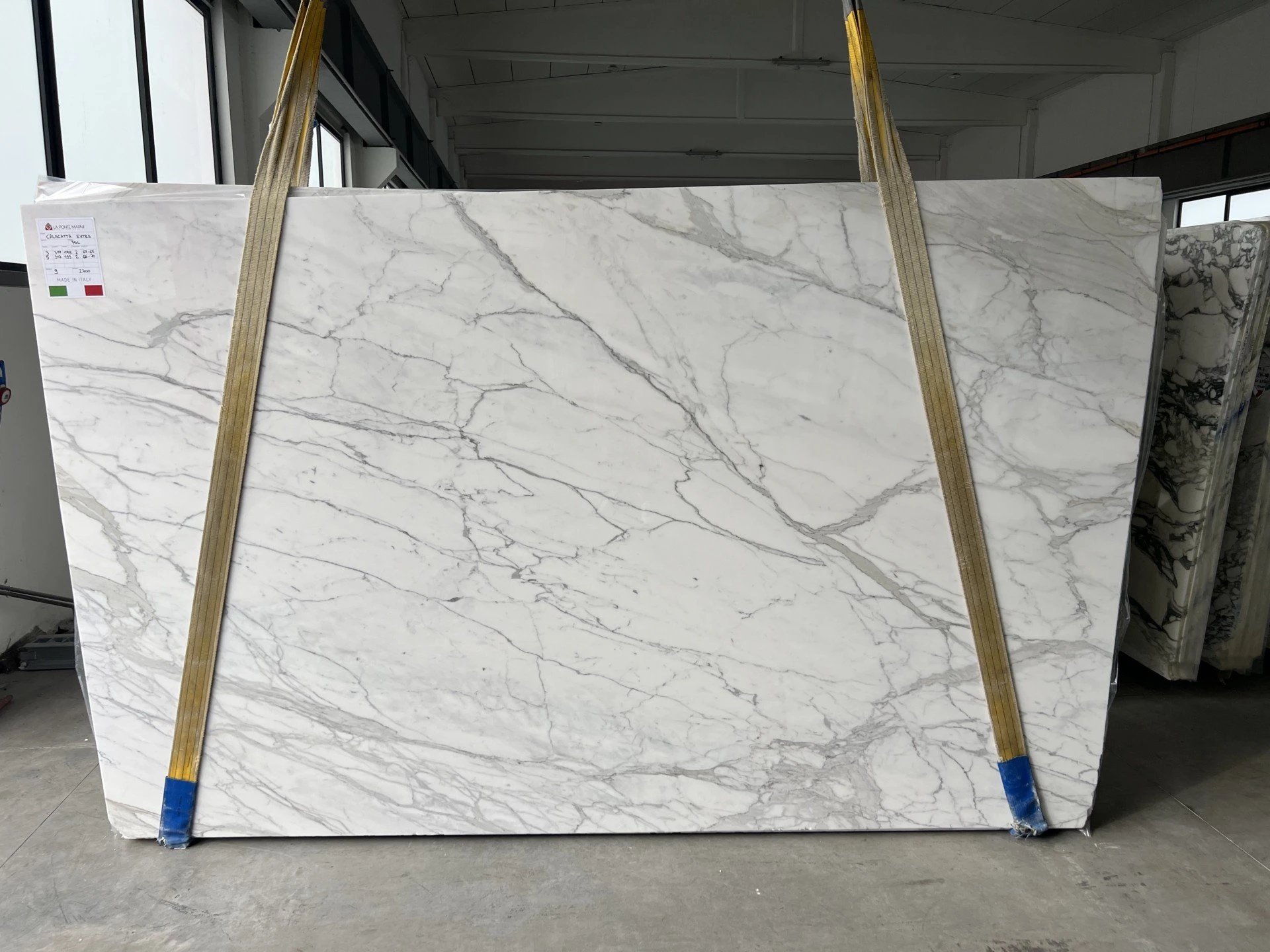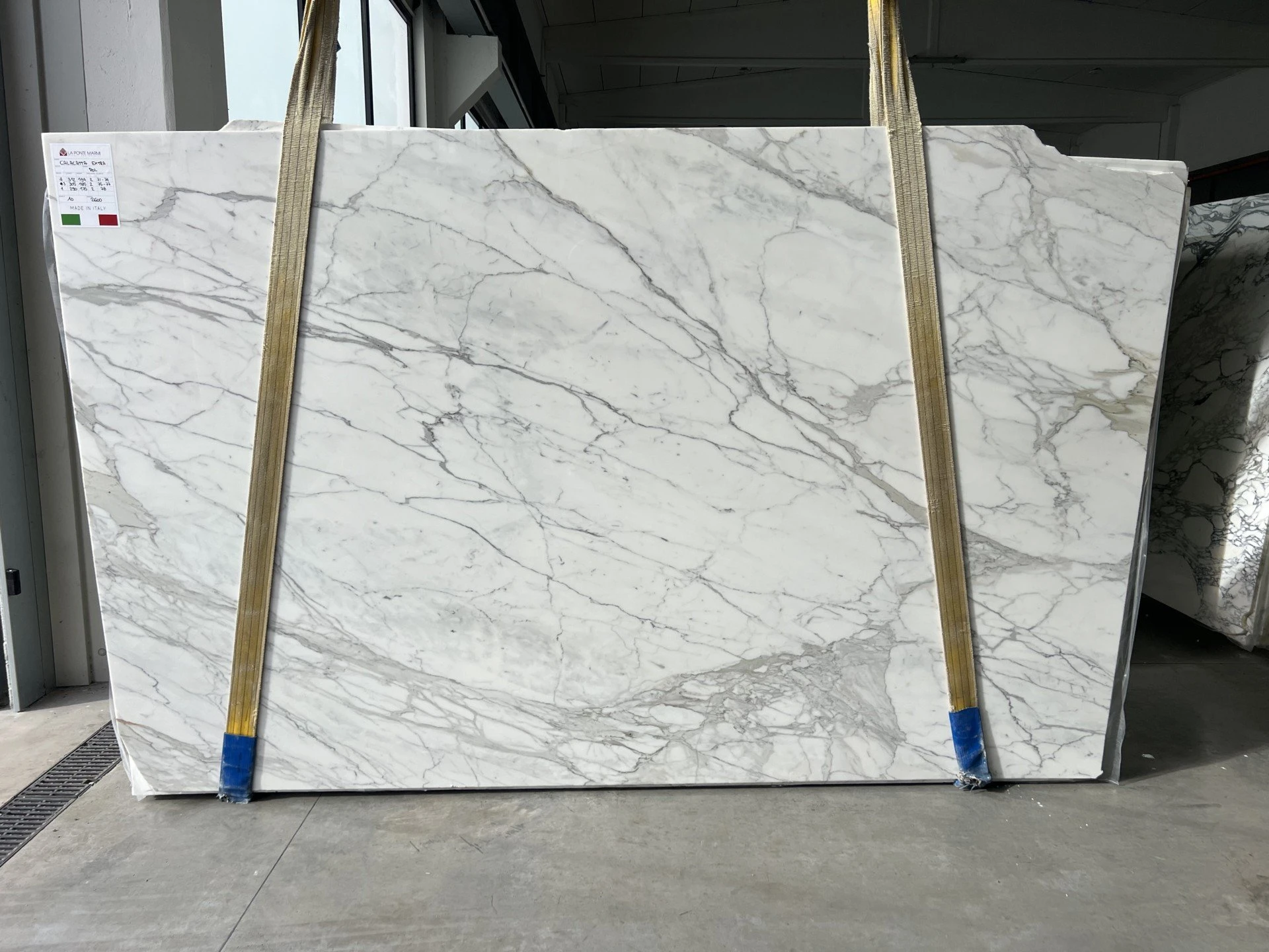 < Torna indietro CALACATTA Tipologia: MARMO Codice blocco: A7881. N. Lastre: 27 Lunghezza: 315 cm Altezza: 192 cm Spessori disponibili: 2 CM. Finiture disponibili: LUCIDO