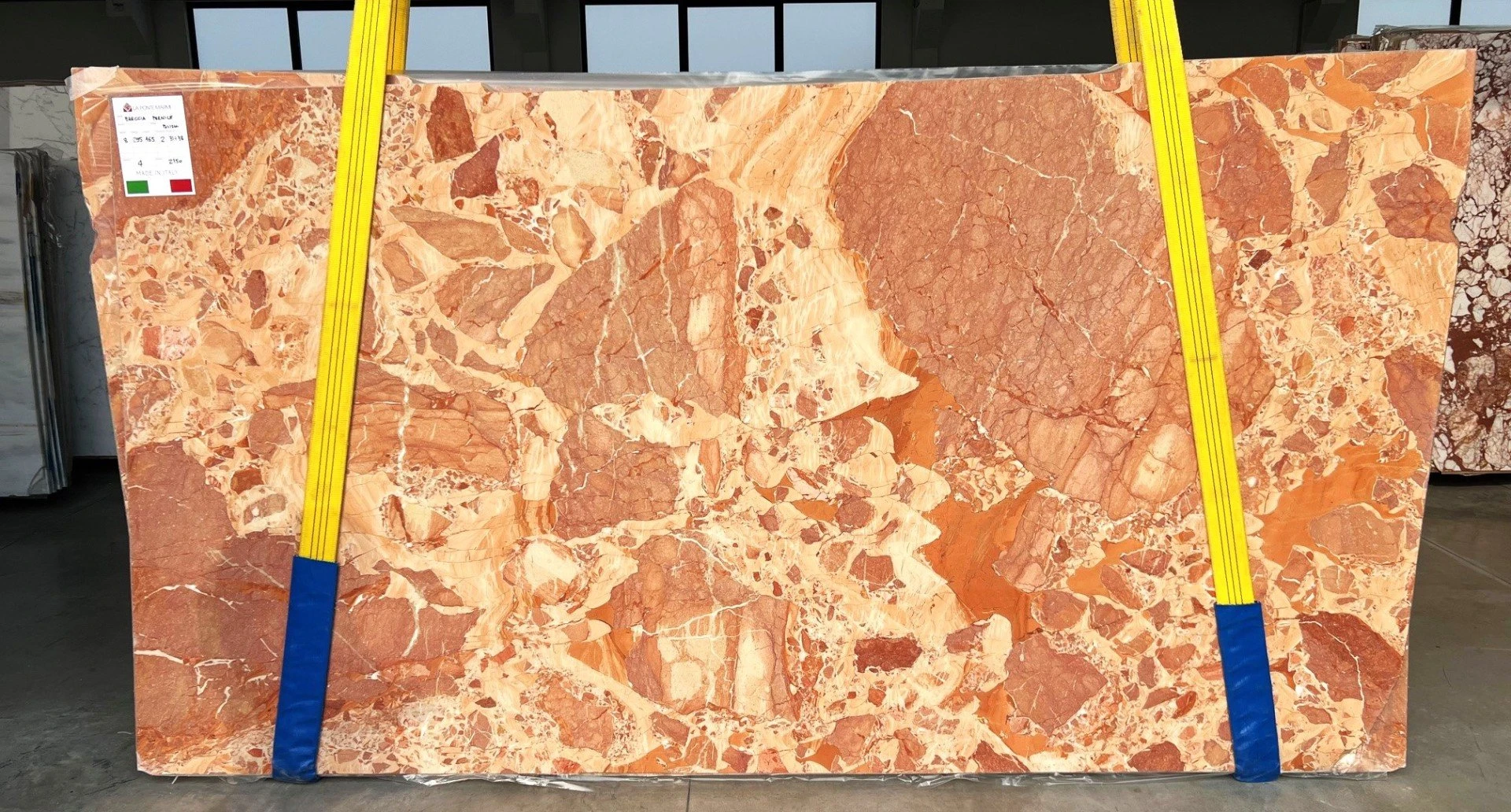 < Torna indietro BRECCIA IMPERIALE Tipologia: QUARZITE Codice blocco: A3164 N. Lastre: 18 Lunghezza: 306 cm Altezza: 165 cm Spessori disponibili: 2 CM. Finiture disponibili: LEVIGATO